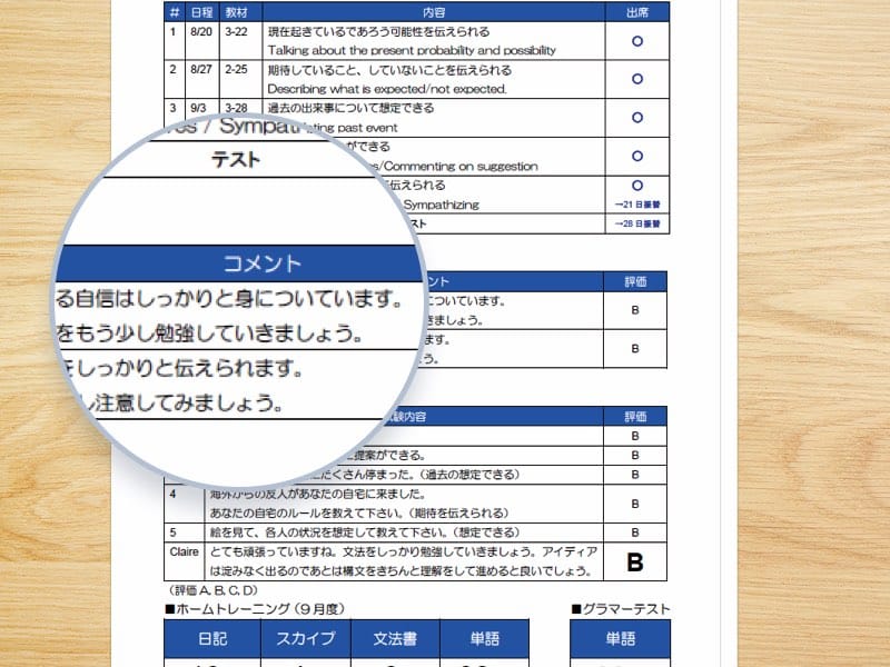 定期的に各テーマを5分間、講師と会話をしてテストをします。学んだことの定着をみます。