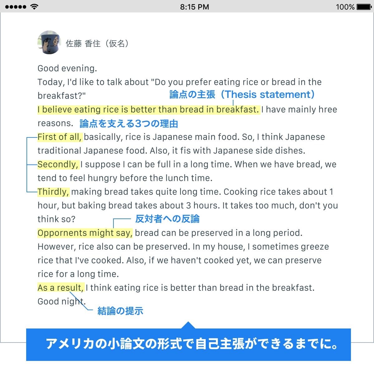 アメリカの小論文の形式で、文章を組み立てられるまでになっています。