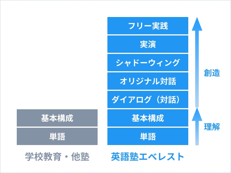 他塾は教科書を「理解」させるだけで終わります。それを英語教育だと考えているところが多い。それでは、自分の言葉で会話することはできません。エベレストは違います。 単語 基本構成 ダイアログ(対話) オリジナル対話 シャドーウィング 実演 フリー実践 の7段階学習法を通して、お子さんが自分の言葉で話す(創造して実践する)までトレーニングします。