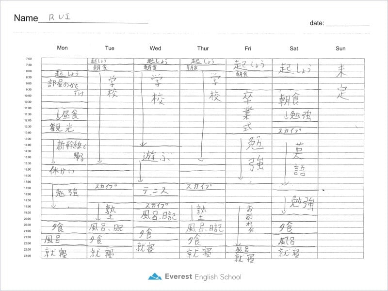 時間がないというより、優先順位がつけられない場合に、そのようなご相談をよく受けます。まず、日々のスケジュールを見える化するところからスタートします。生活の中に英語を使う時間を組み込むプログラムです。この際、何のために英語を学ぶのか、何を優先し、何をあきらめるのかを再確認します。 自分の目標に対して行動を一致させるため、適切な質問とその回答を通じて英語学習の優先度を上げ、日々のスケジュールに組み込みます。しかし、それでもやれないこともあるでしょう。その場合、コーチングのスタイルで生徒の気持ちに寄り添いながら、一緒に計画を立てていきます。私たちは、生徒の学習の伴走者としてサポートしています。