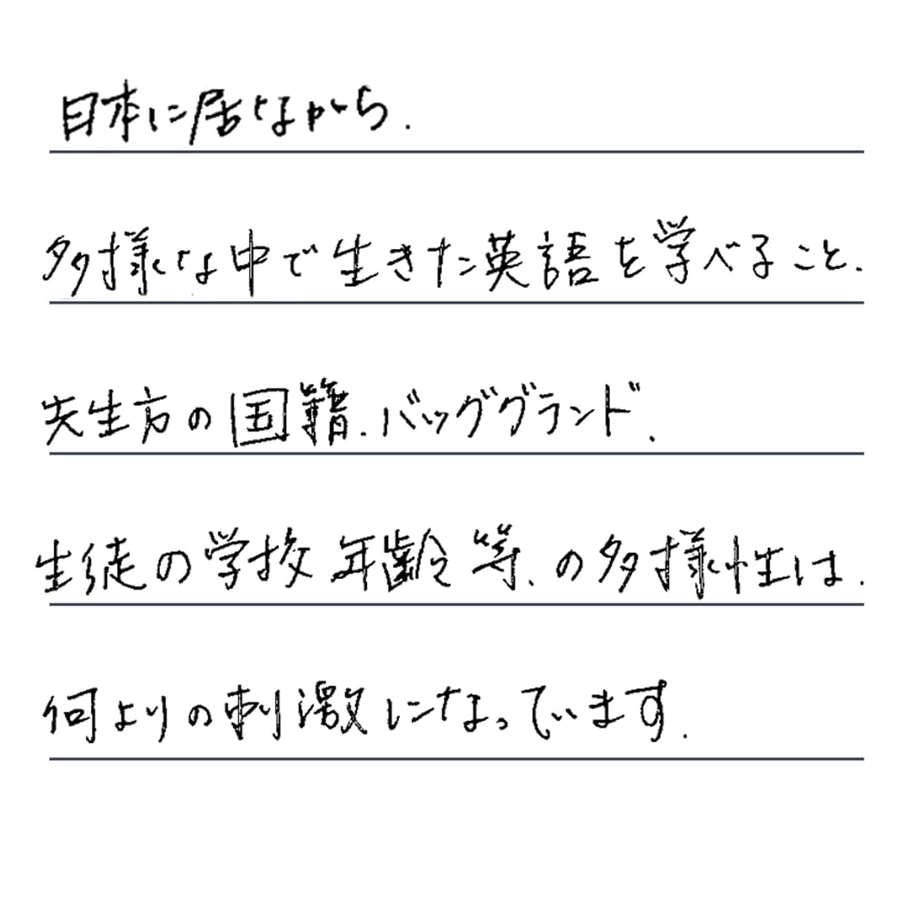 教育とは本来、「生き方を見出すお手伝い」を することなのだと思っています。 これまでの学校教育はテストの問題の 解き方を教えることがメインでした。 理解をさせて記憶力を測るのがテスト。 それを教育というのであれば、それは間違いです。 一つの物差しだけでお子さんの魅力は測れません。 生徒はもっと多面的で 色んな可能性を秘めています。 英語を通じてひとりひとりが 自分の生き方を見つけられるよう、 全力でサポートします。